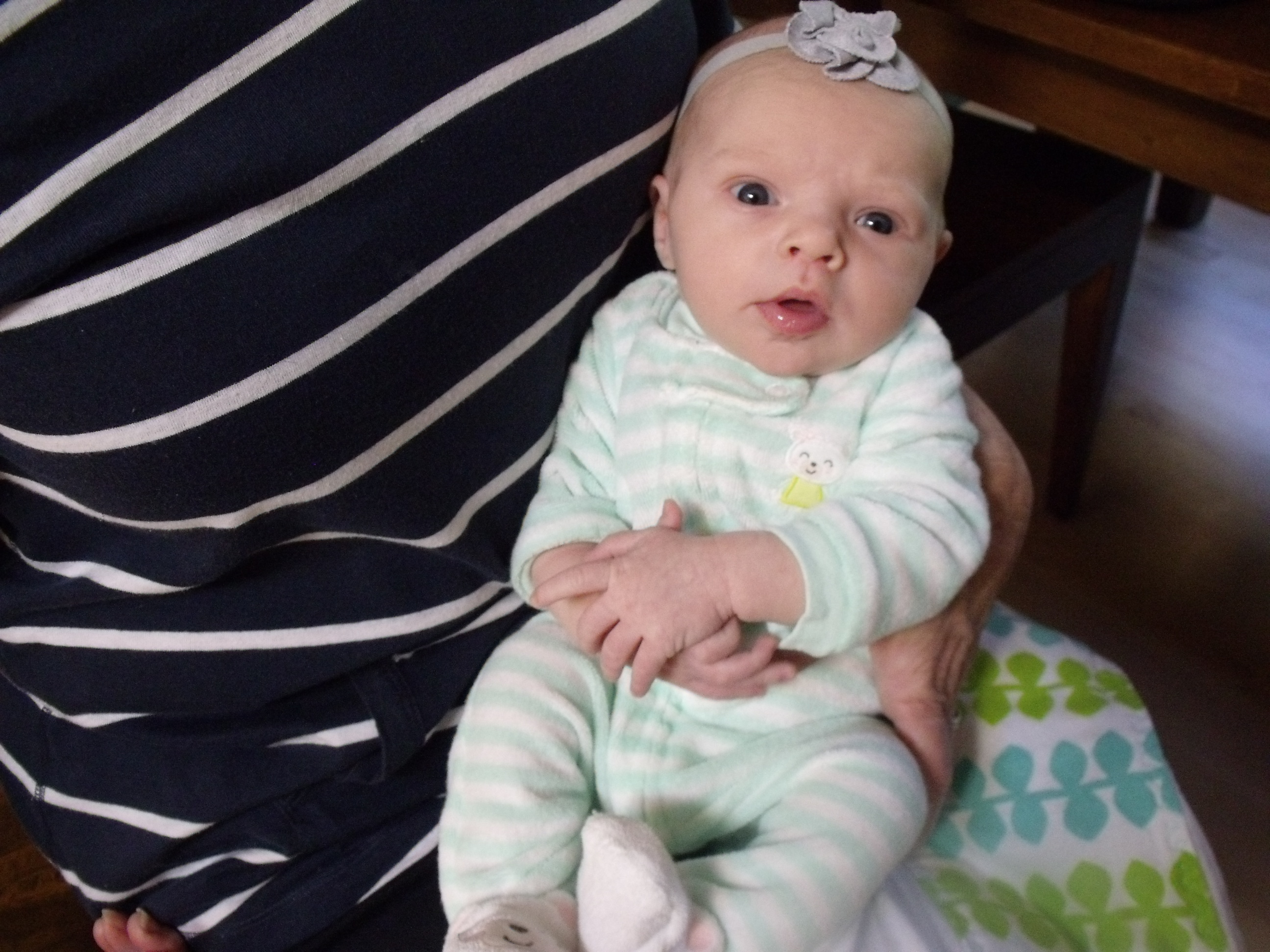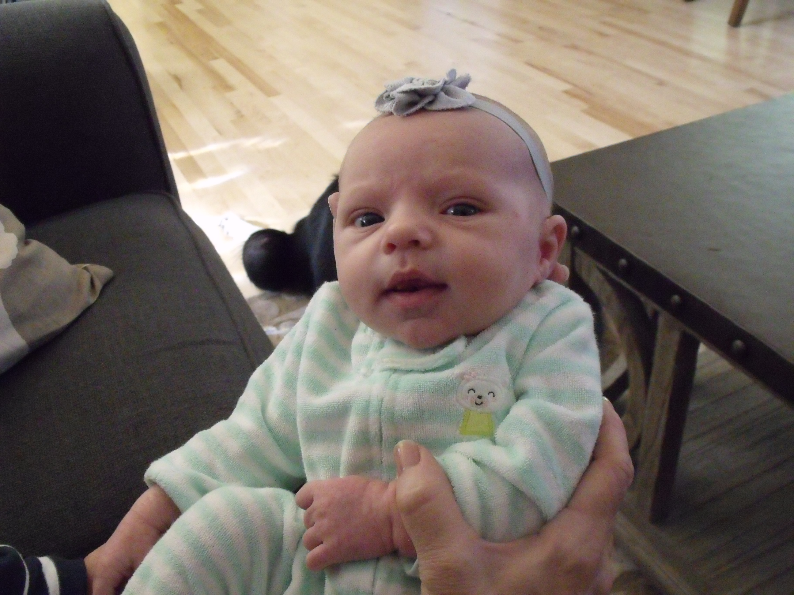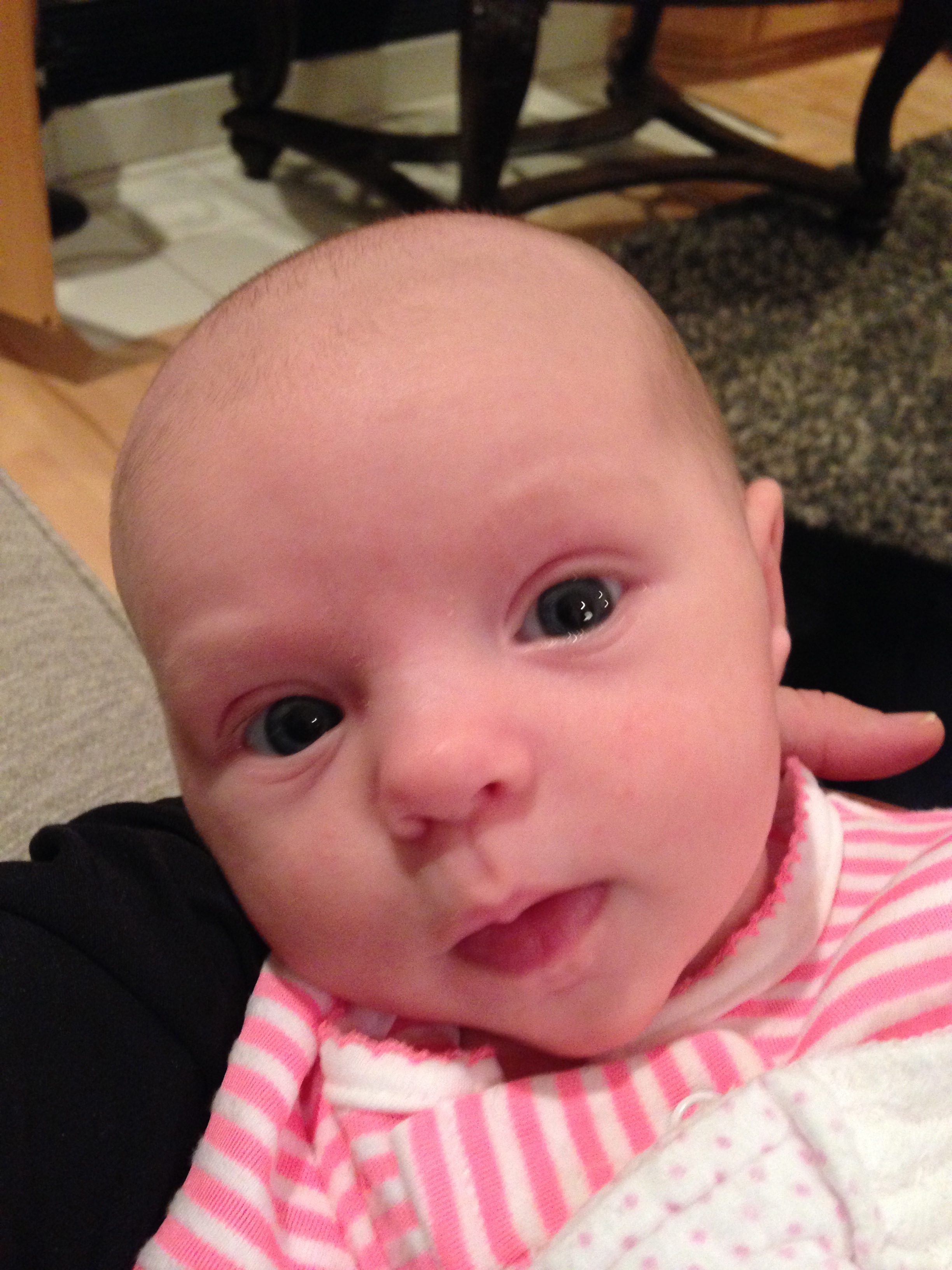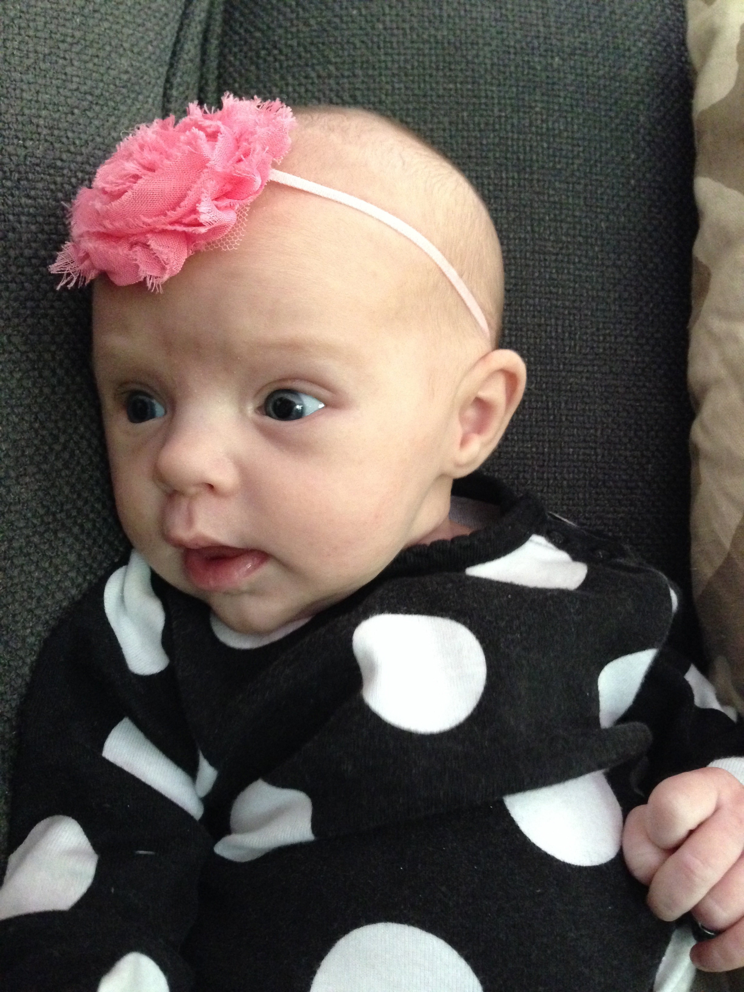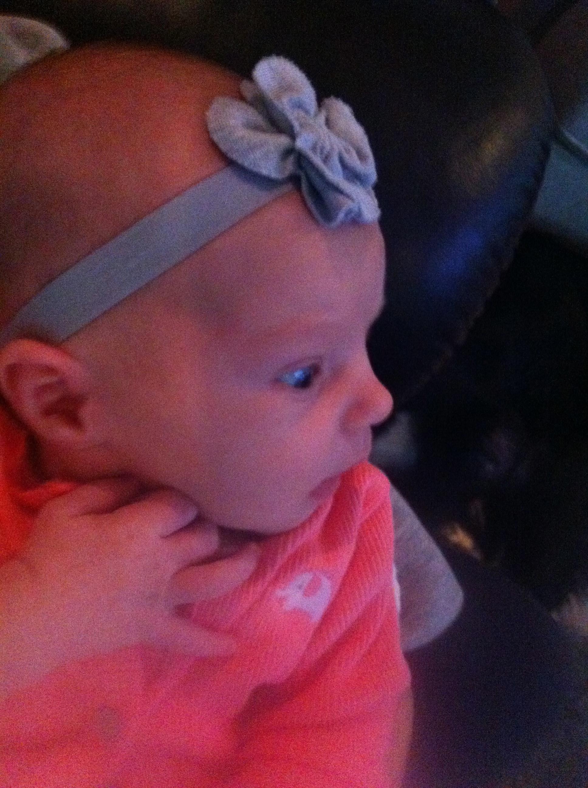 Sleeping/ Eating: Same Sleeping 12 am – 5 am, 6 am -9 am. I hope in the next few weeks we can get her to go to bed earlier. She is pretty consistently a three hour little clock. Eating is the same half feeding half formula.