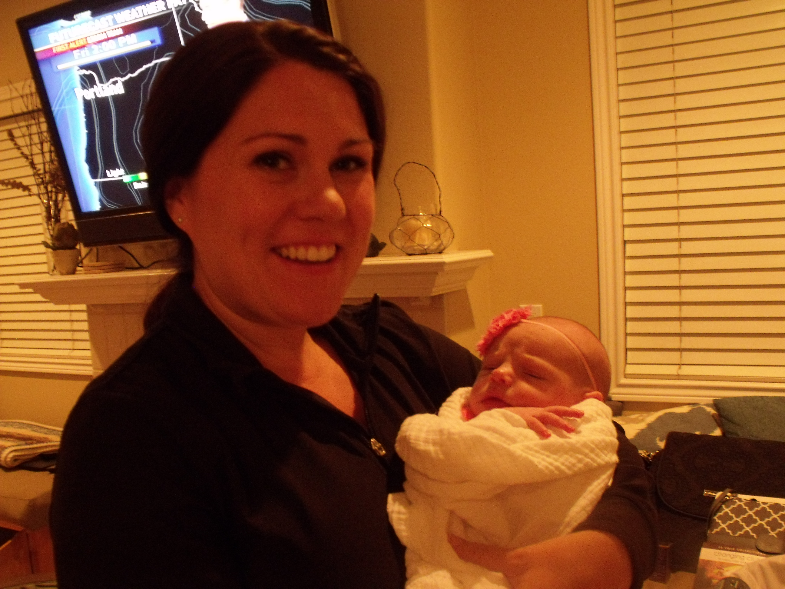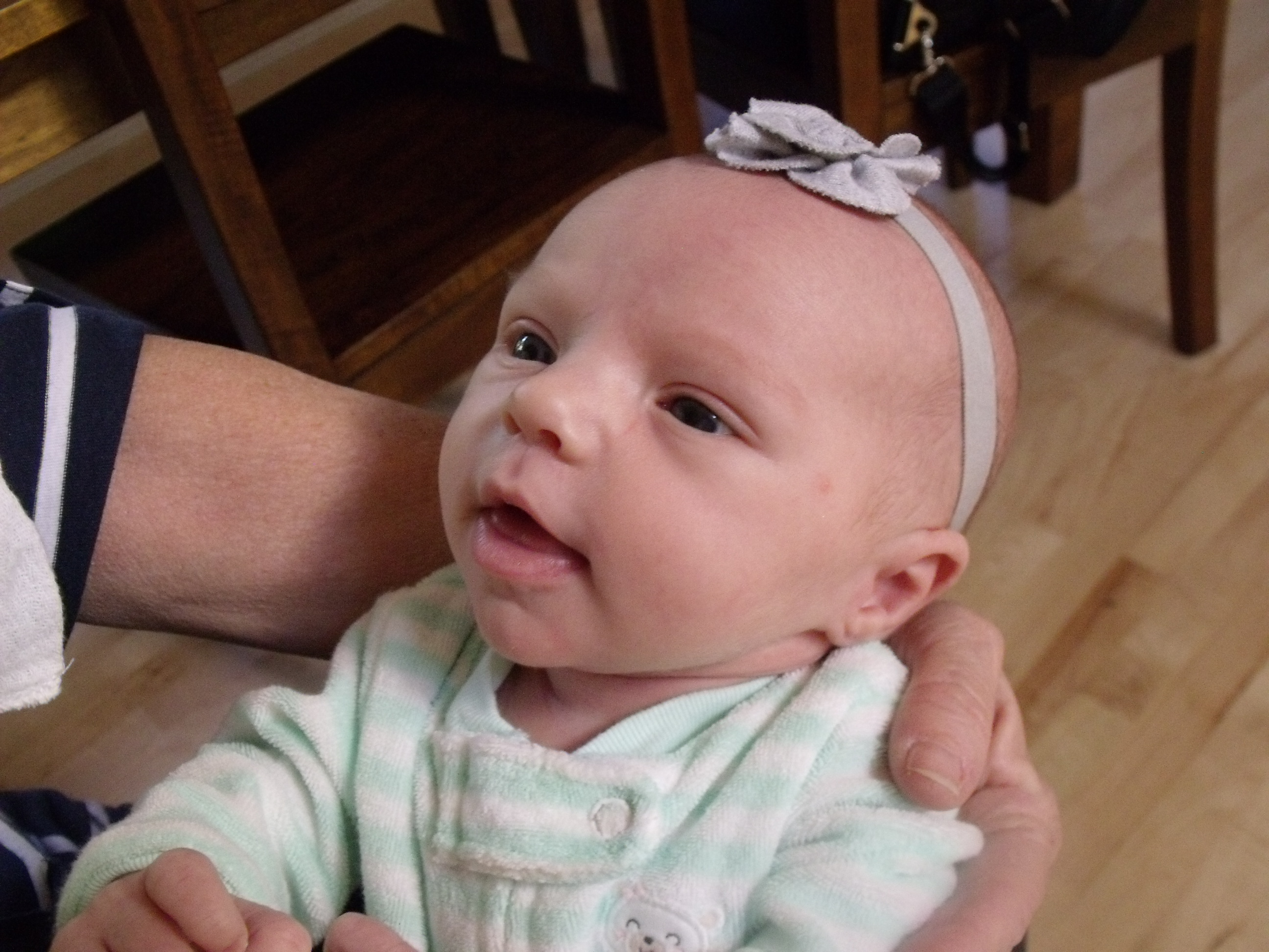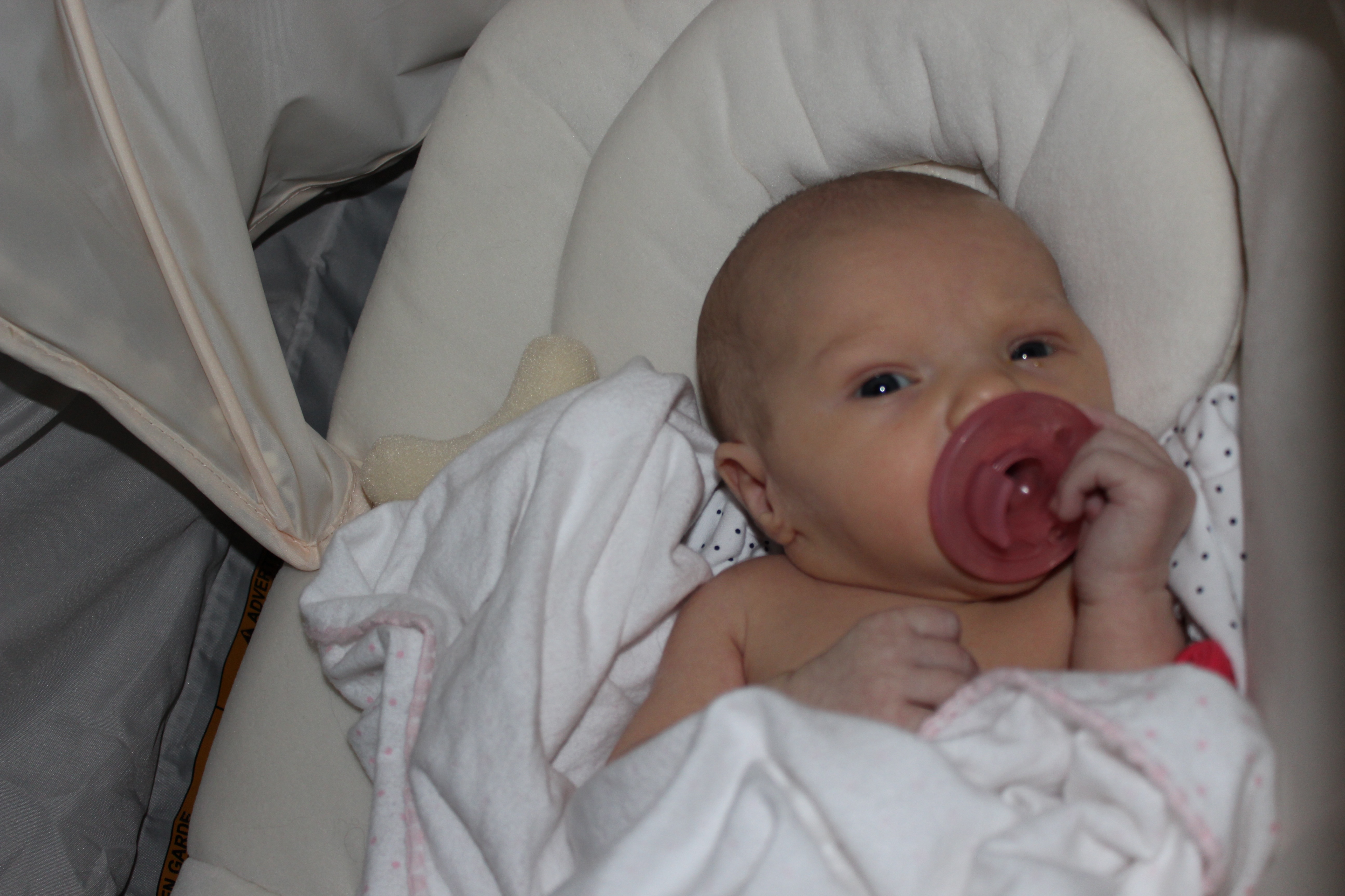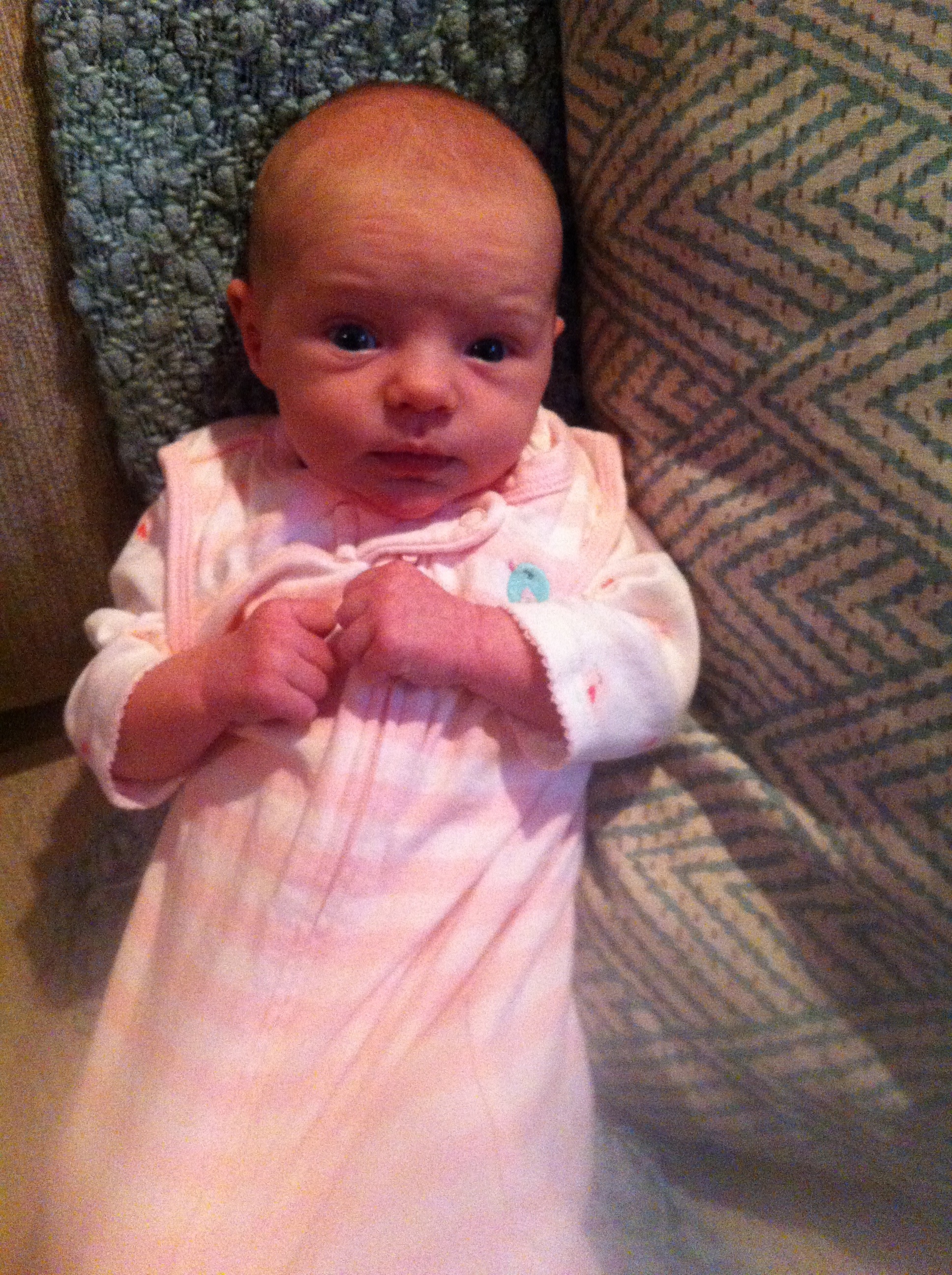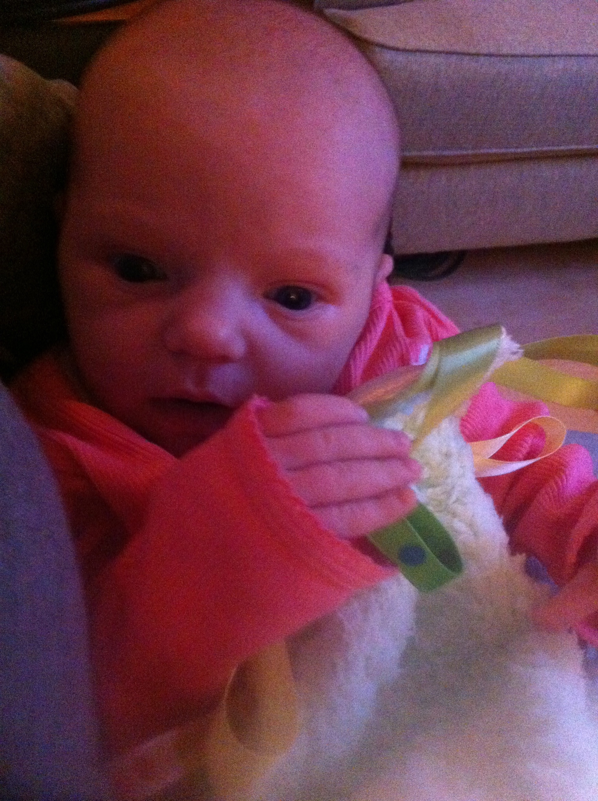 Sleeping/ Eating: Same Sleeping 12 am – 5 am, 6 am -9 am. I hope in the next few weeks we can get her to go to bed earlier. She is pretty consistently a three hour little clock. Eating is the same half feeding half formula.