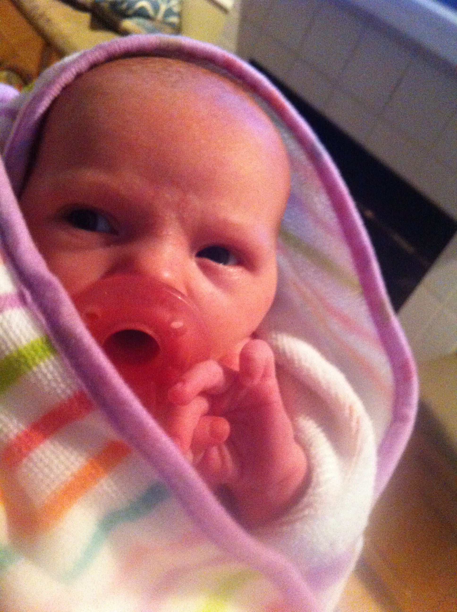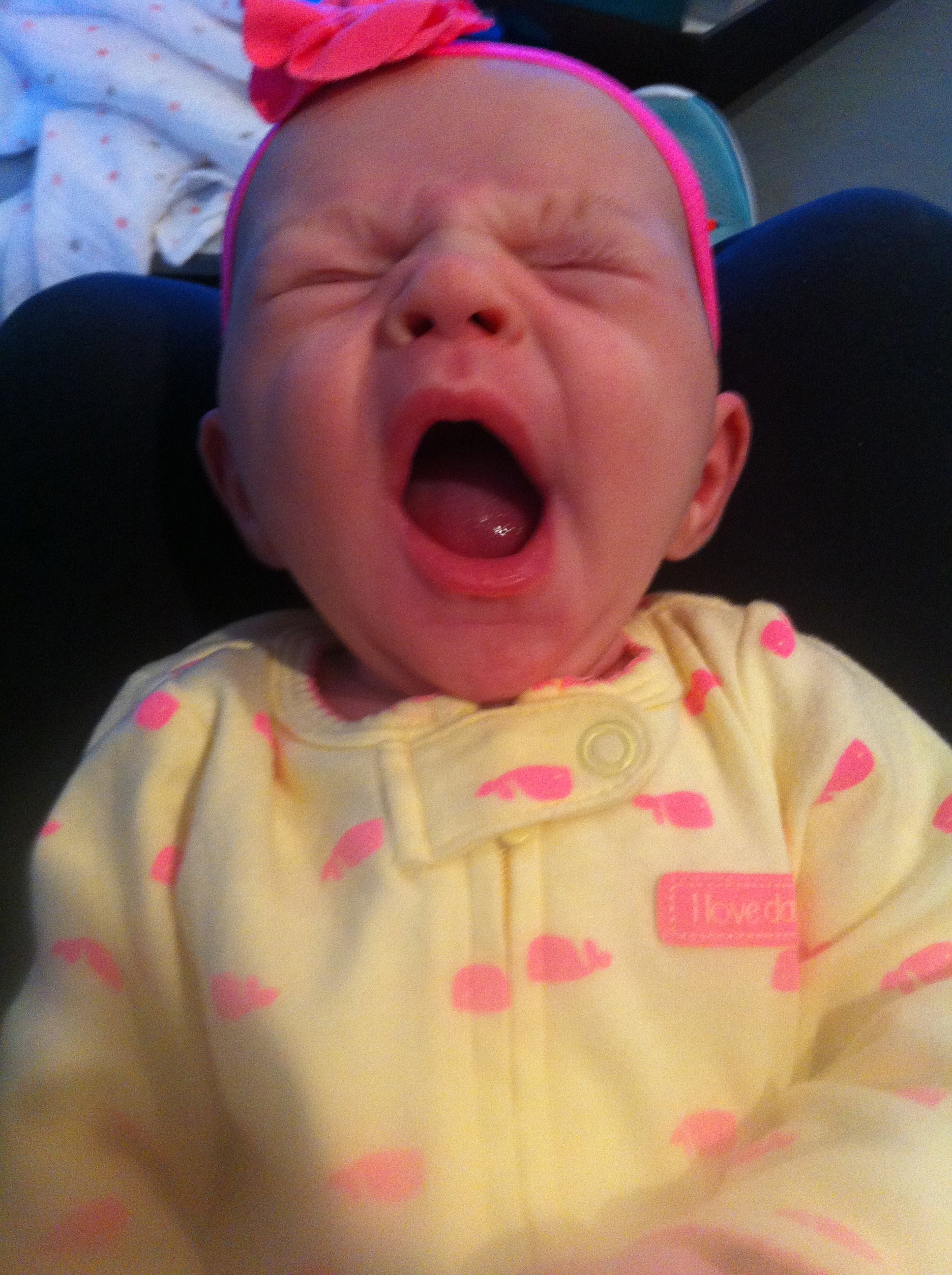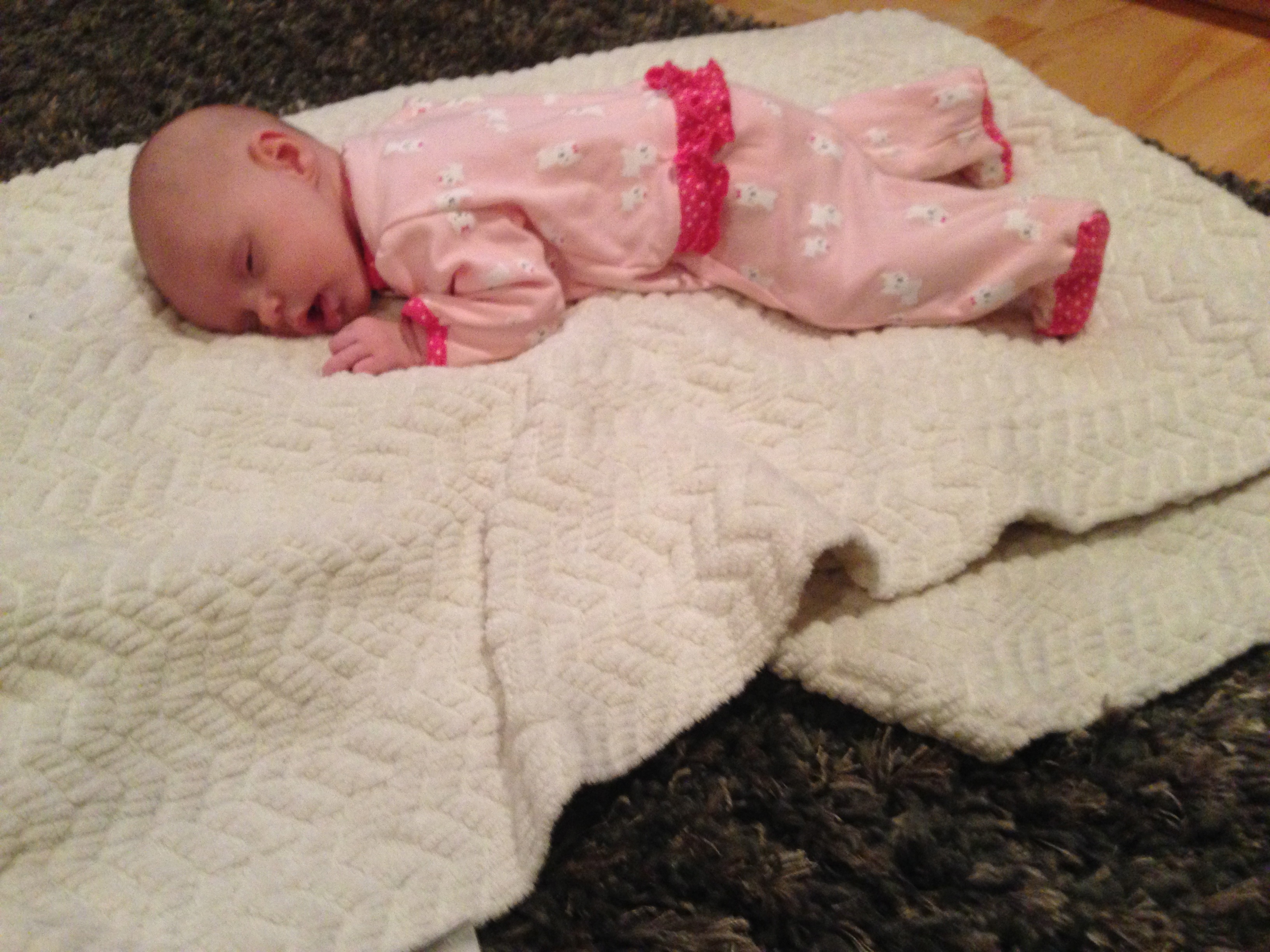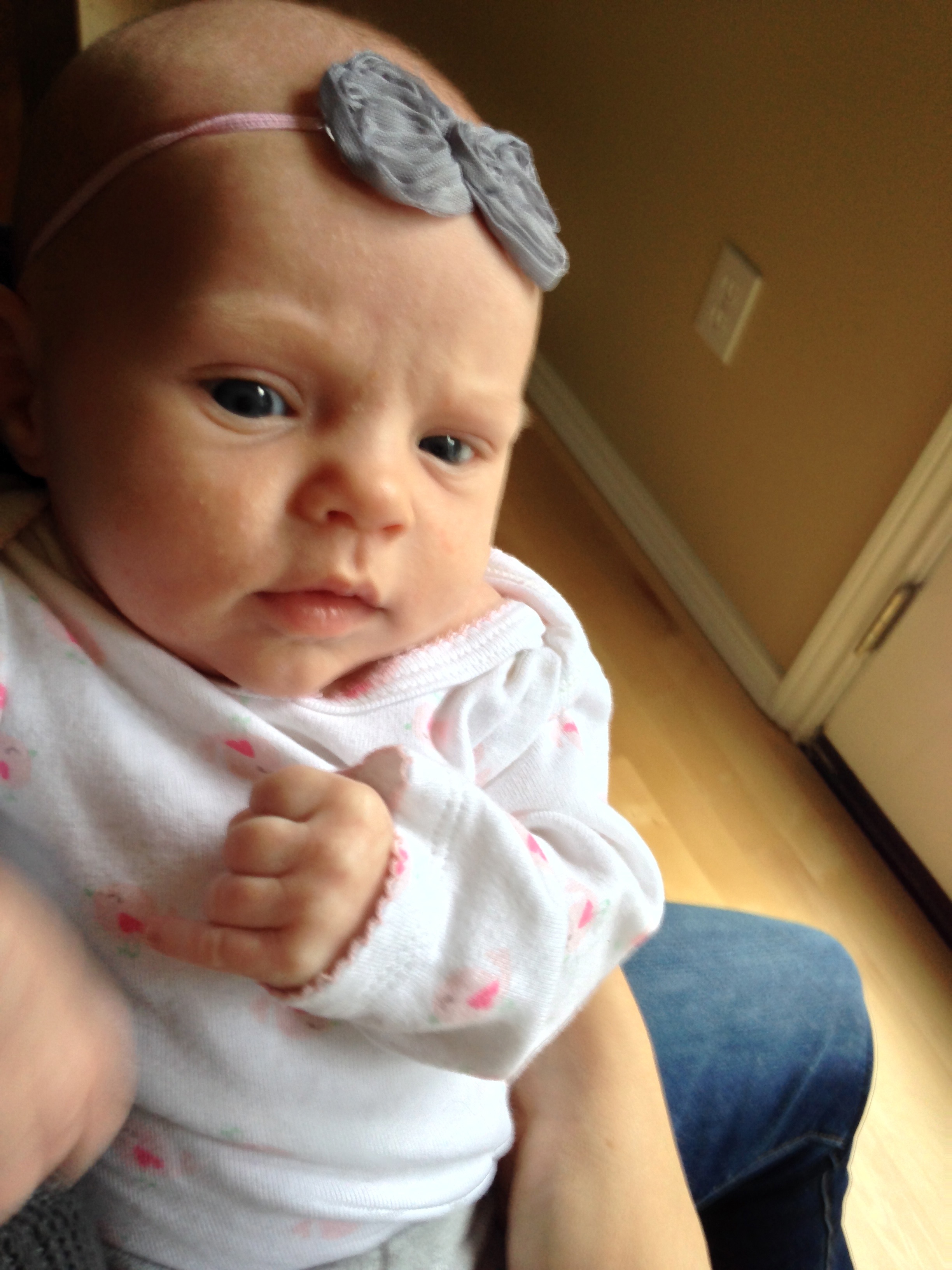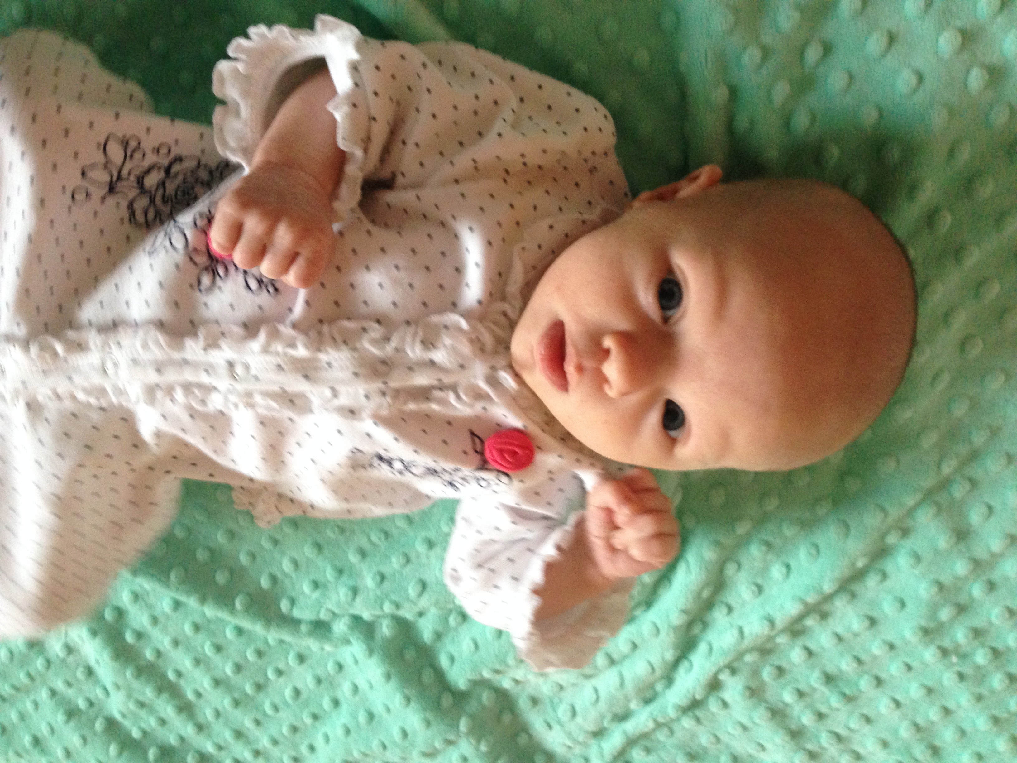 Sleeping/ Eating: Same Sleeping 12 am – 5 am, 6 am -9 am. I hope in the next few weeks we can get her to go to bed earlier. She is pretty consistently a three hour little clock. Eating is the same half feeding half formula.