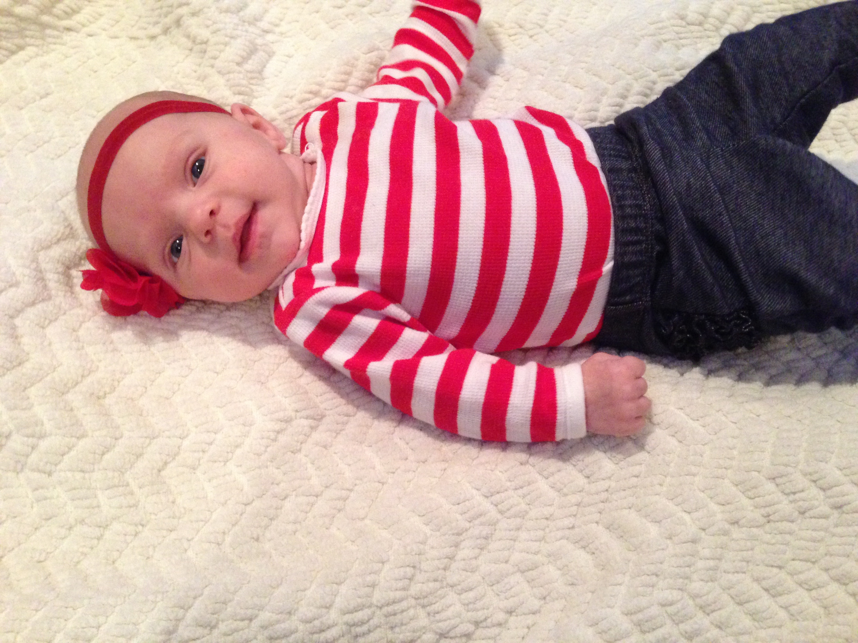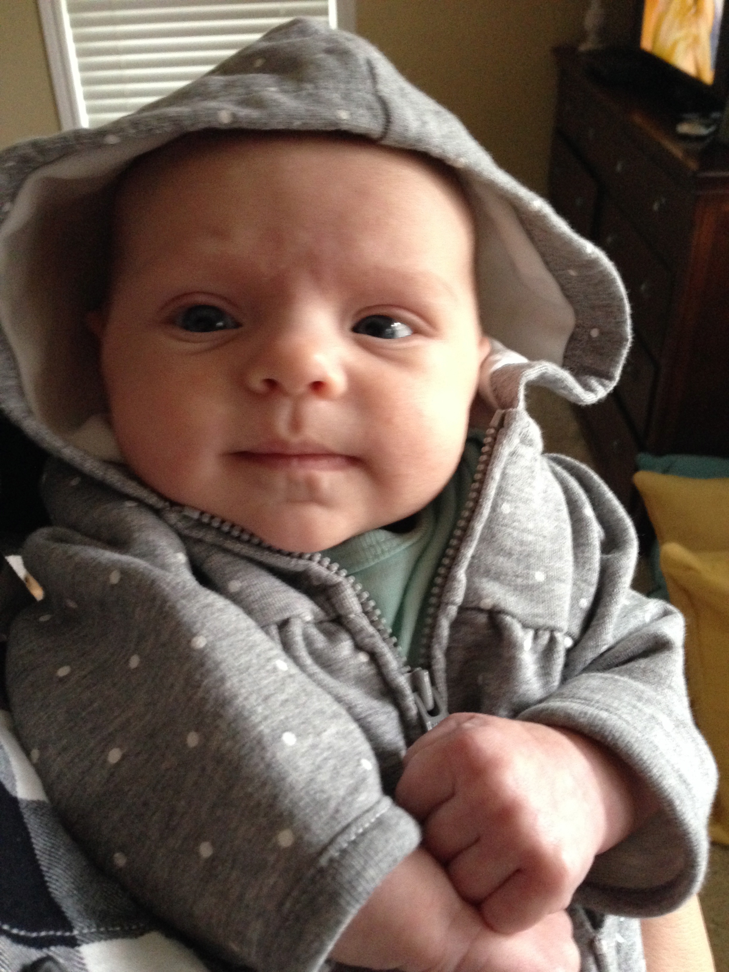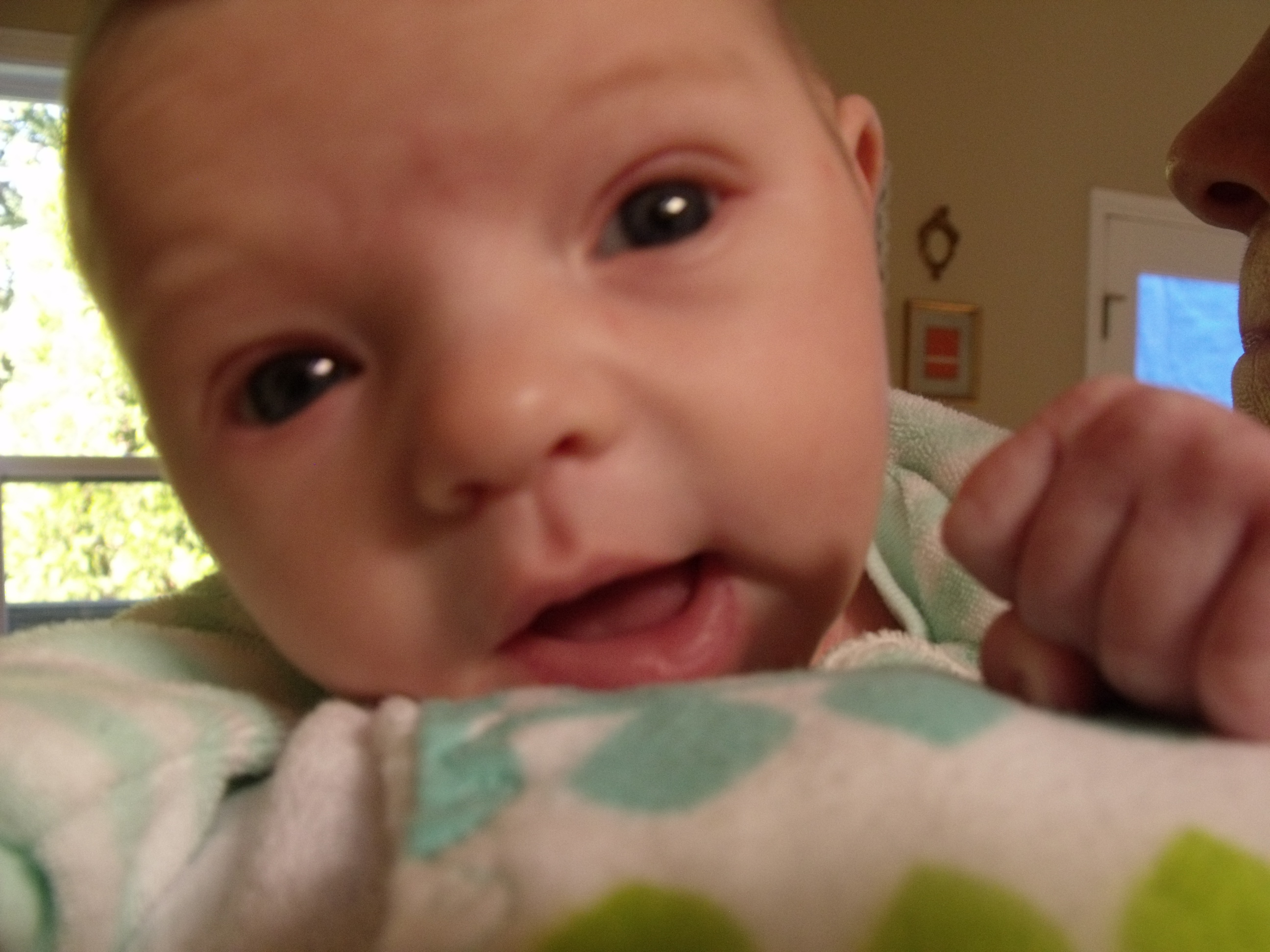 Avery’s Favorites: She still LOVES her bouncer chair. I think she can see everything better and we play in it several times a day. I noticed she started grabbing burp rags, blankets, and my clothes so I got her a wubbanub paci (pacifier attached to a stuffed animal). This little giraffe paci is now a favorite and it is much easier for her to get it back in her mouth on her own since she is holding the little animal. Towards the end of the week she noticed a rattle toy so we will see if she likes that more.